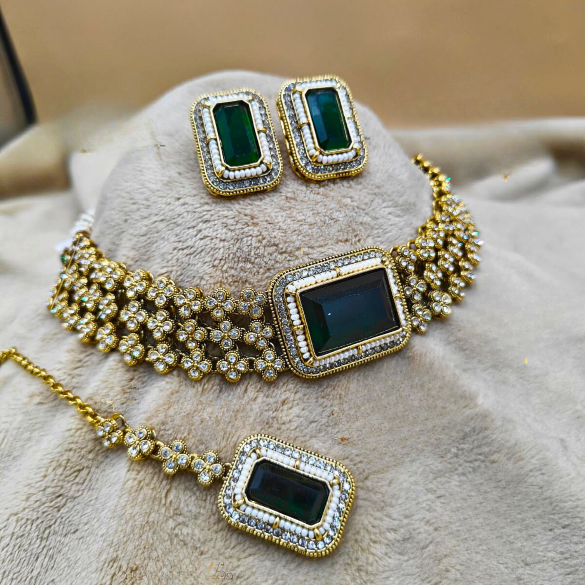 Make a regal statement with this Emerald Zariya Floral Kundan Jewellery Set, featuring a bold rectangular green stone centerpiece, intricate kundan floral detailing, and matching stud earrings with maang tikka. Crafted in premium gold-tone finish, this wedding jewellery set is perfect for brides, receptions, and festive occasions. A timeless choker set designed to elevate sarees and lehengas effortlessly.