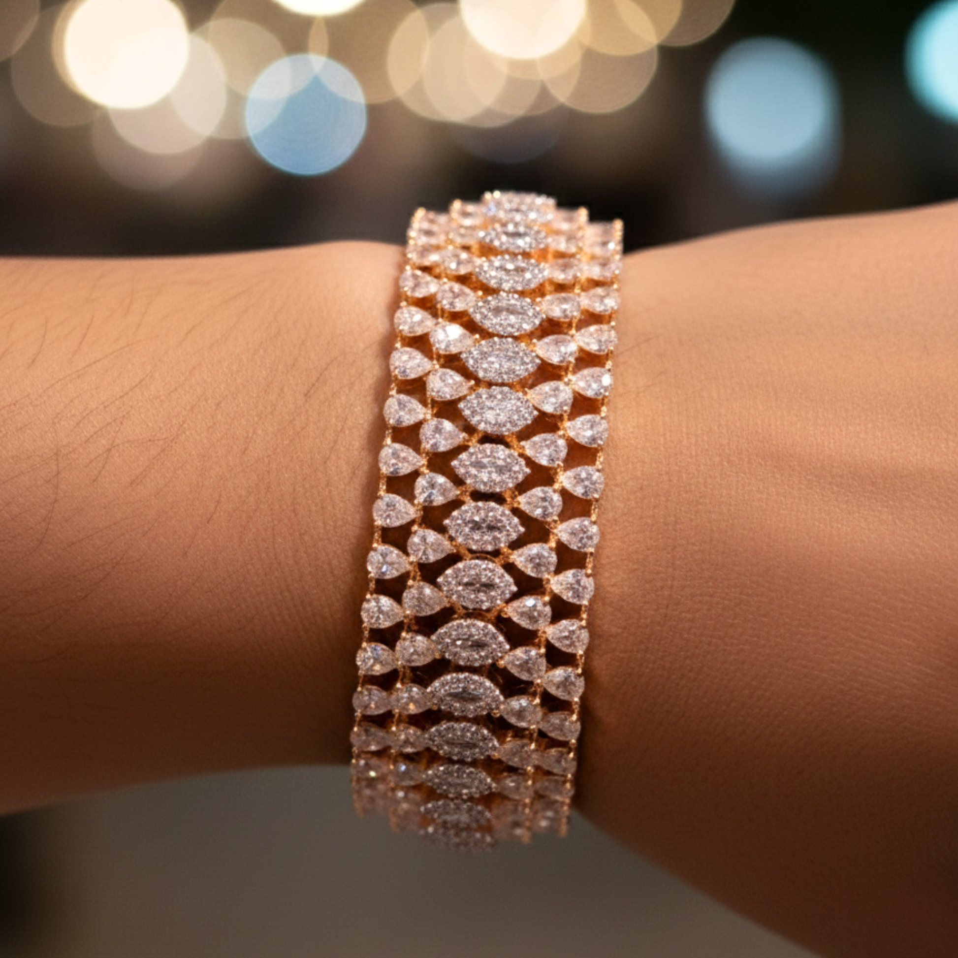 This exquisite gold bracelet showcases a stunning floral design, crafted with intricate detail. The band is adorned with shimmering diamonds, creating a dazzling effect. The centerpiece is a magnificent floral cluster, composed of larger diamonds arranged to resemble petals, exuding elegance and luxury.